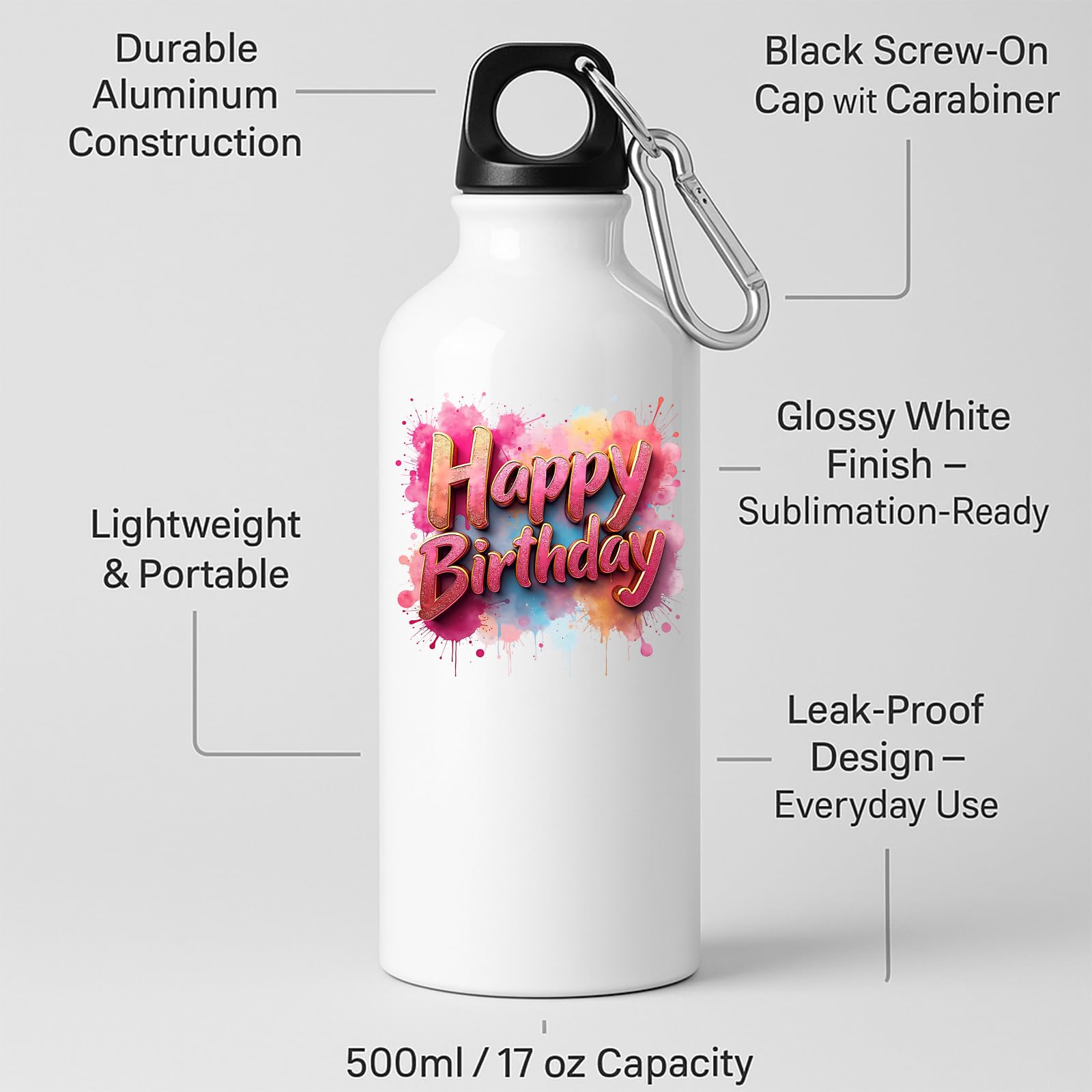 Happy Birthday Water Bottle Colourful Splash Print Reusable Fun Birthday Gift for Him Her or Kids Lightweight Drink for School Work Gym or Outdoor Use